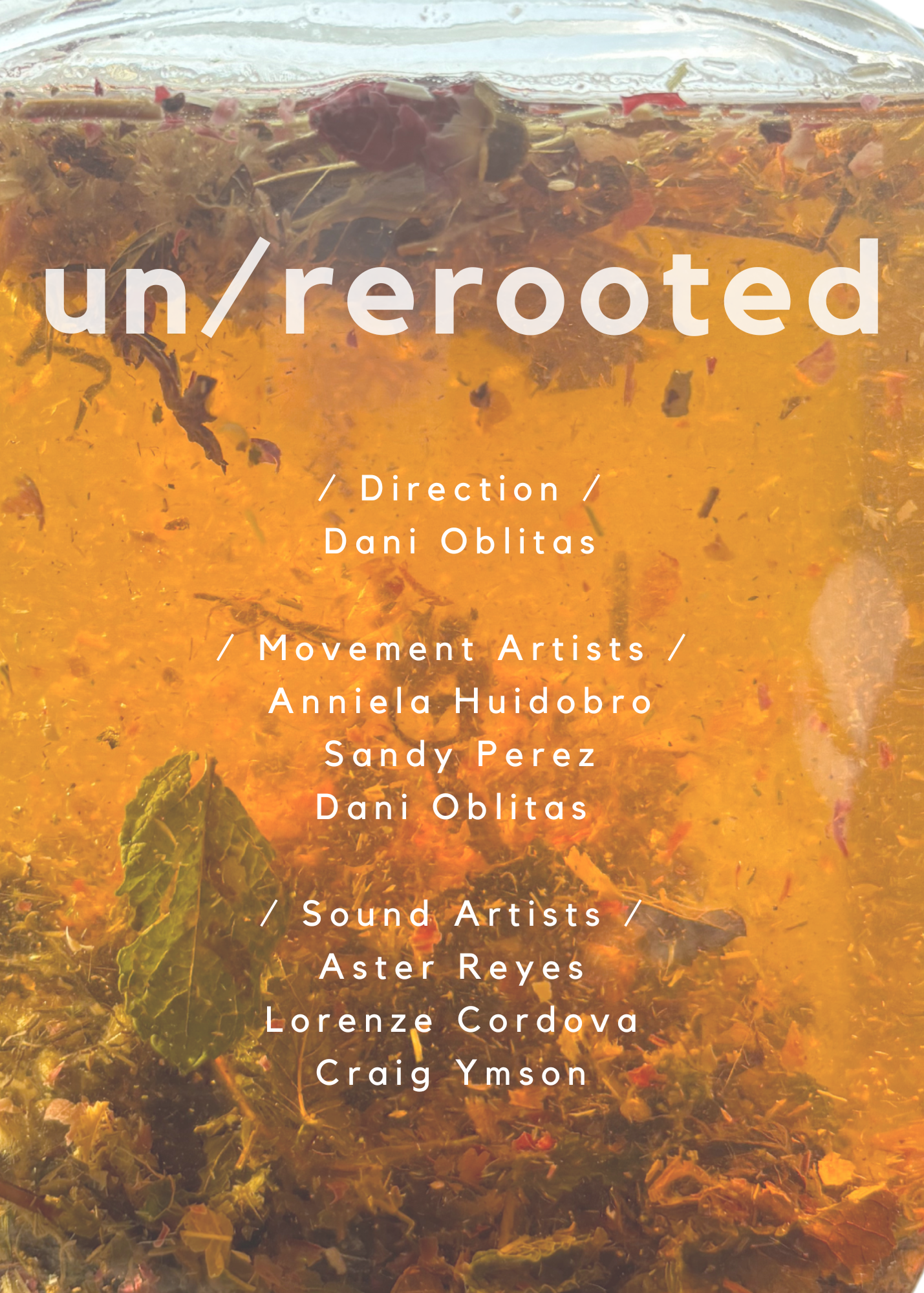 Un/Rerooted is a meditative performance rooted in herbal plantitas to guide our spirit and identity from a place of disconnection to our ancestors and homeland– an exploration of borders, community, and connection with our ancestral land and roots. How can we reconnect with ourselves, our identity, and our spirit to rebuild cultural connections and community? What was lost (individually and collectively) and how do we find it again? What rememberings do we hold within ourselves where the body becomes a site of resistance and memory? The six performers embark on a journey of isolation, ritual, gates, connection, and migration to find these answers for themselves and as a collective. Using a combination of improvisational scores, tasks, and set material for both the movement and sound artists, each performance lives in its own container– only existing within that moment in time.